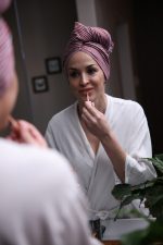 Fasten the twisted part with the elastic band that will hold your hair in place and ensures it dries correctly.
